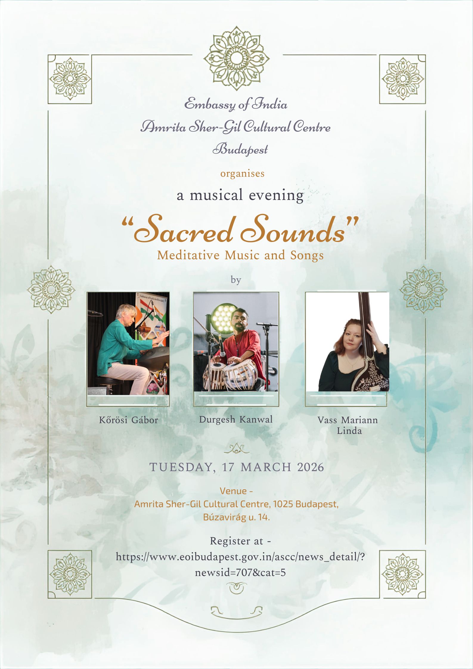 Amrita Sher-Gil Cultural Centre, Embassy of India, Budapest is organizing a cultural programme at its Auditorium on 17 March 2026 at 6 PM titled „Sacred Sounds – Meditative Music and Songs”. The evening will showcase India-inspired meditative melodies, where voice and sound create a space for inner stillness, devotion and presence.
