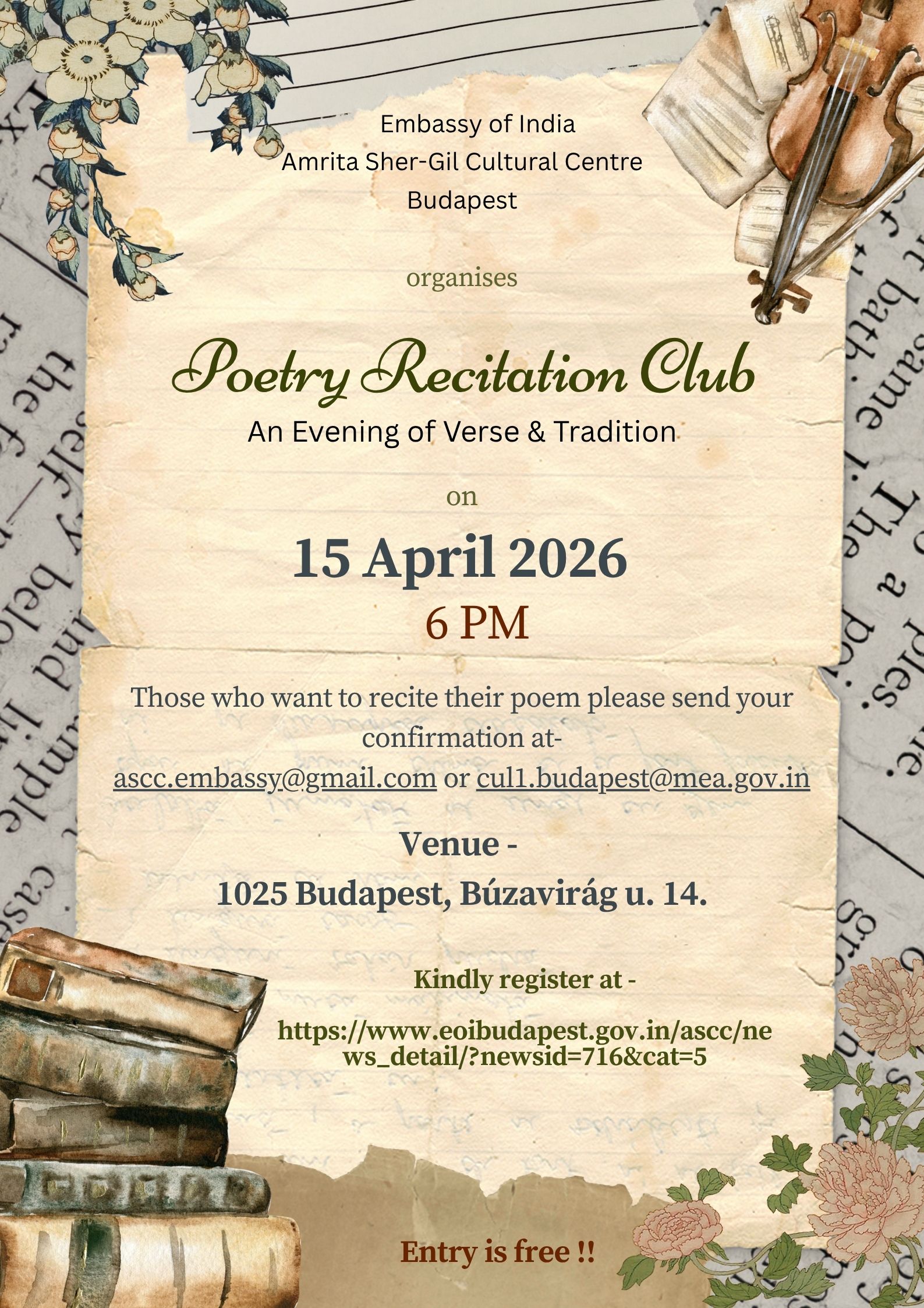 The Amrita Sher-Gil Cultural Centre is organising a Poetry Recitation Evening on 15 April 2026, and warmly welcomes all literature and poetry lovers. Anyone can participate in the program, whether with their own poem or a recited piece, in any language (English, Hungarian, Hindi).